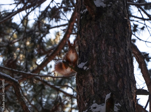 © New Africa, Obraz premium Cute squirrel on pine tree in winter forest