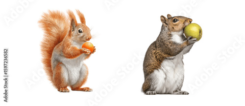 © Thuntaree, Obraz premium Cute Squirrel with Nut and Gray Squirrel Holding Green Fruit