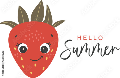 Fototapeta premium Cute strawberry fruit vector, Fruit with face, Happy strawberry vector, Summer fruit with eyes, Kids funny illustration