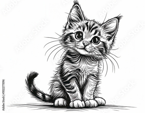 Fototapeta premium Cute striped kitten sitting and looking curiously at the viewer with big...