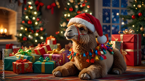 Naklejka premium cute stuffed Camel wearing a festive Santa hat with colorful pile of wrapped...