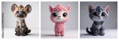 Fototapeta premium Cute stylized animal characters, a hyena, alpaca and cat, presented on a plain background. Each one has large eyes and adorable features for a heartwarming vibe.
