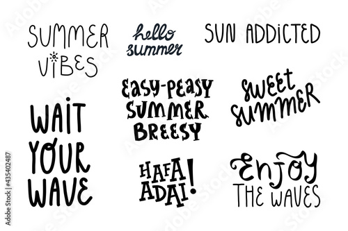 Fototapeta premium Cute summer lettering set. Funny quotes, slogans like Easy-peasy summer breezy, Wait your wave, hello, Sun addicted.