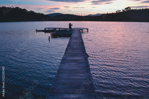 © paymphoto, Obraz premium cute sunrise on the pier over the lake