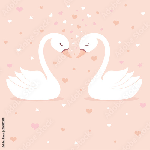 Fototapeta premium Cute swans on pink background. Children's card or shirt design.