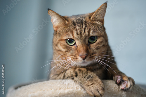 Fototapeta premium Cute tabby cat lying down on the coach. Funny home pet. Concept of funny face and green eyes. High quality photo