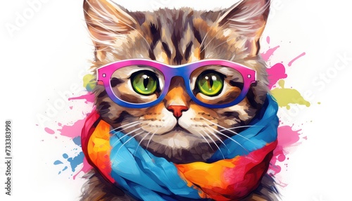 Fototapeta premium Cute tabby cat wearing colorful scarf Fashion portrait of an anthropomorphic...