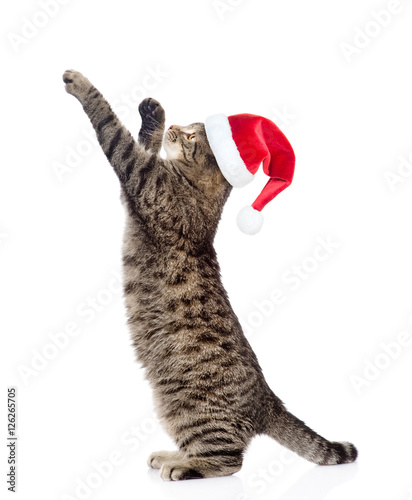 Obraz premium Cute tabby kitten in red christmas hat standing on hind legs. isolated on white
