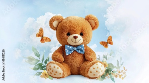 © Pricha.RT, Obraz premium Cute teddy bear doll with polka dot bow in soft blue watercolor style