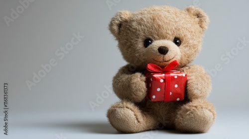 © jumino, Obraz premium Cute teddy bear holding a small gift box.