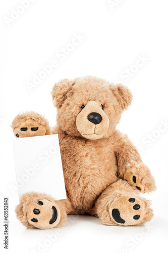 Obraz premium Cute teddy bear holding blank board