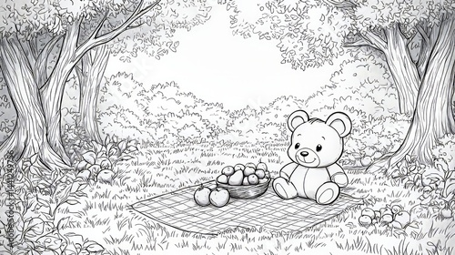 © Watasiwa, Naklejka premium Cute Teddy Bear in a Serene Forest Setting with Apples and Blanket