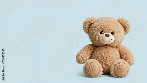 © Lasvu, Obraz premium Cute teddy bear on a wood backdrop with a copy space in blue.