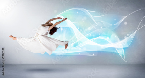 Naklejka premium Cute teenager jumping with abstract blue scarf around her
