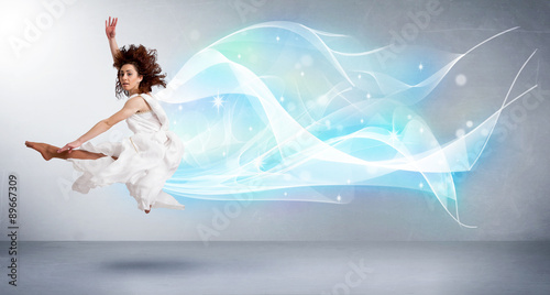 Naklejka premium Cute teenager jumping with abstract blue scarf around her