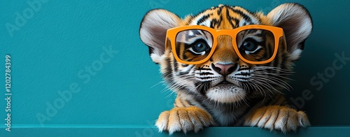 © Creative_Bringer, Fototapeta premium Cute tiger cub wearing sunglasses against a teal background, playful and cool
