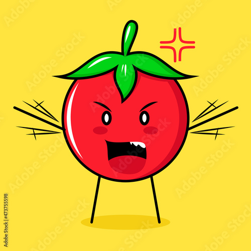 Obraz premium cute tomato character with angry expression. green, red and yellow. suitable for emoticon, logo, mascot. both hands raised and mouth open
