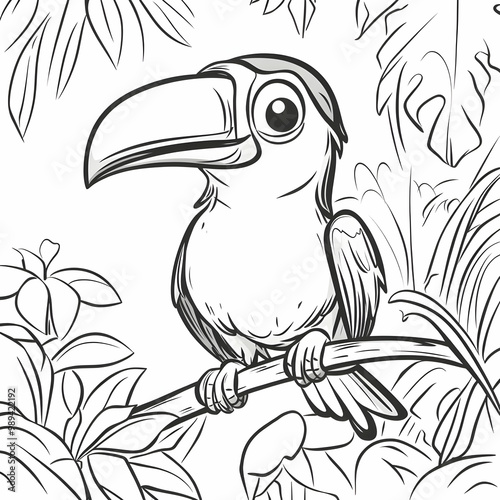 © KALEYA, Naklejka premium Cute Toucan Illustration on Branch with Tropical Plants