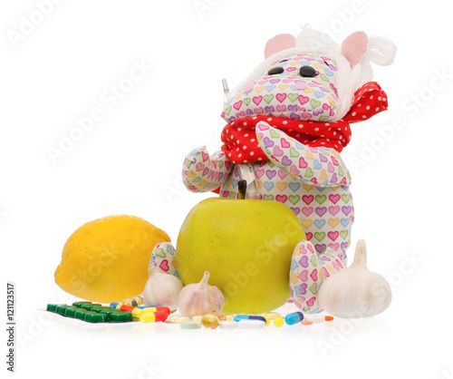 © DenisNata, Obraz premium Cute toy hippopotamus with pills - handmade, isolated on white background