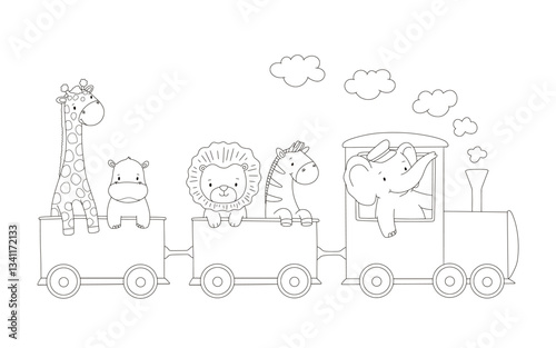Fototapeta premium Cute train with african animals. Outline zebra, elephant and giraffe, cartoon...