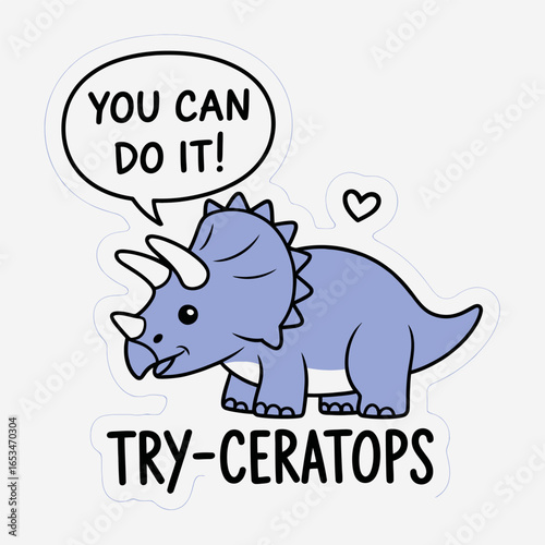 © Syed 39, Obraz premium Cute triceratops cartoon with encouraging message isolated on white background you can do it speech bubble and tryceratops text make it a fun and motivational illustration