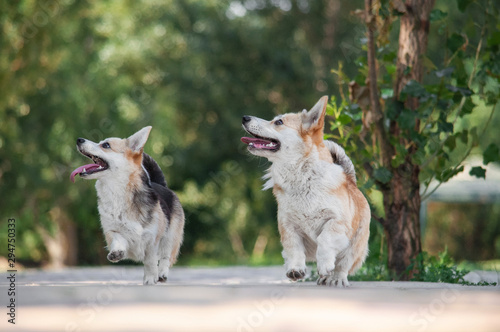 © Sergii, Fototapeta premium cute tricolor and bicolor dogs welsh corgi pembroke with standing ears