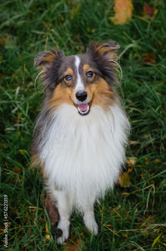 © Anastasiia, Fototapeta premium Cute tricolor dog sheltie breed in fall park. Young shetland sheepdog on green grass and yellow or orange autumn leaves