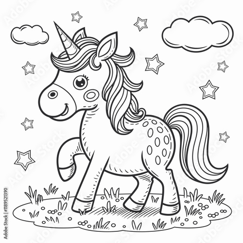 Fototapeta premium Cute Unicorn Coloring Page with Stars and Clouds