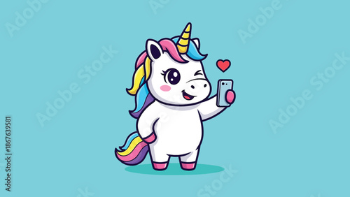 Naklejka premium Cute Unicorn Holding Smartphone with Heart Icon.