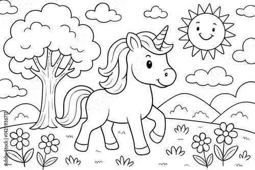 Naklejka premium Cute Unicorn in a Sunny Meadow Line Art Illustration