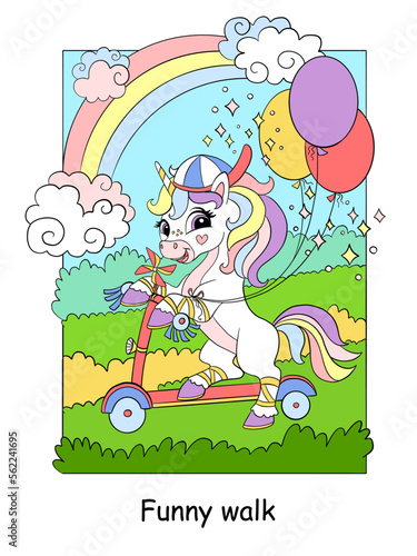 Fototapeta premium Cute unicorn riding a scooter kids color illustration