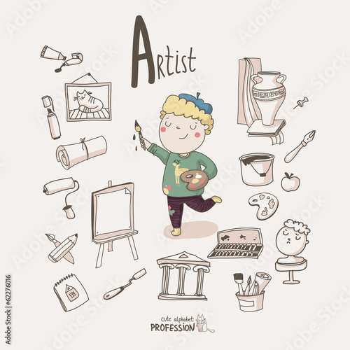© dikaya888, Fototapeta premium Cute vector alphabet Profession. Letter A - Artist