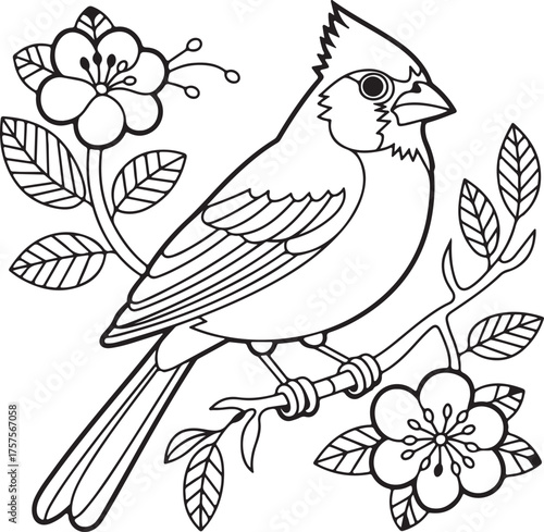 © Keya Khanam, Obraz premium Cute vector bird illustration on a tree branch with flowers and leaves