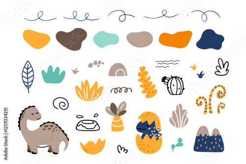 © Olha, Naklejka premium Cute vector set with different dinosaurs, mountains, volcanoes, palm trees, clouds, eggs, footprints. Vector illustration. Creative children's animals.