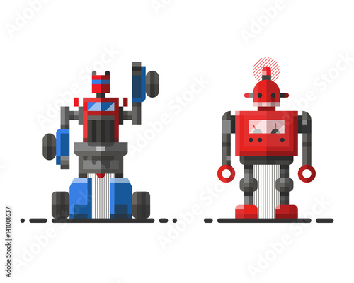 © partyvector, Fototapeta premium Cute vintage robot technology machine future science toy and cyborg futuristic design robotic element icon character vector illustration.