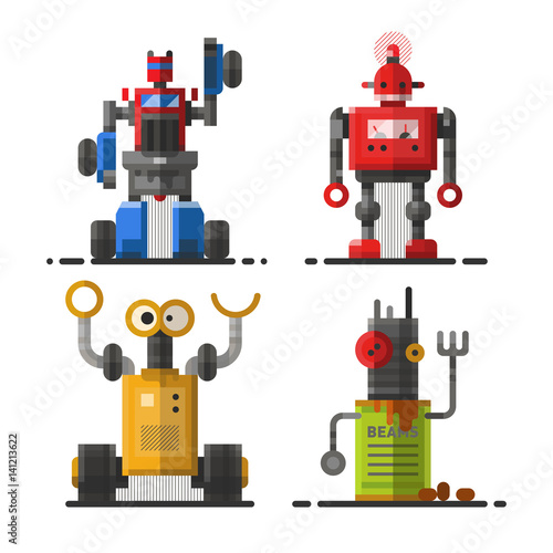 © partyvector, Fototapeta premium Cute vintage robot technology machine future science toy and cyborg futuristic design robotic element icon character vector illustration.