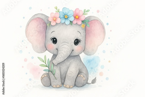 © Ula, Naklejka premium Cute watercolor baby elephant with flower crown illustration isolated on white