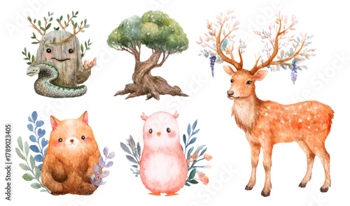 © vectorizer88, Fototapeta premium Cute Watercolor Cartoon Animals and Trees with Isolated Transparent Backgrounds