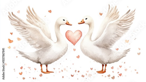 © Nunnaphat, Obraz premium Cute Watercolor Geese Flying with Hearts