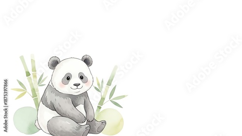 © Efendi, Obraz premium Cute Watercolor Panda Sitting with Bamboo Stalks on White Background