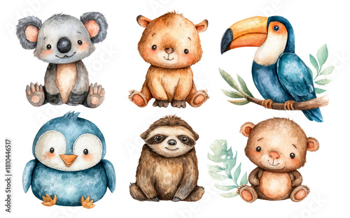 Obraz premium Cute Watercolor Tropical Animals Featuring Koala, Bear, Toucan, Sloth, and Penguin