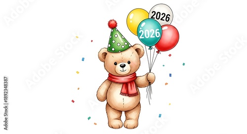 Obraz premium Cute watercolour teddy bear celebrating new year 2026 with balloons
