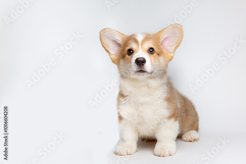 © Olesya Pogosskaya, Obraz premium Cute Welsh corgi puppy sits isolated on a white background looking at the camera