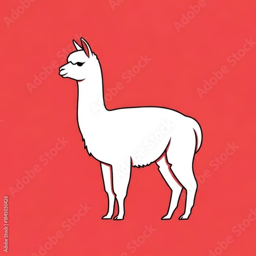 © bauthitam, Obraz premium Cute White Alpaca Standing on a Solid Red Background.