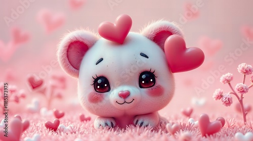 Obraz premium Cute, white, bear-like character with pink heart accents on its head is shown in a field of pink hearts