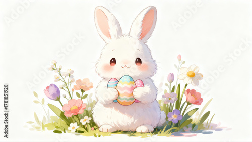 © apit13, Obraz premium Cute white bunny holding egg, Easter egg