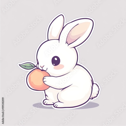 Fototapeta premium Cute white bunny holding peach, digital art, plain background, children's...