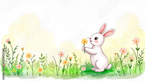 Fototapeta premium Cute white bunny sniffing a flower in a flower meadow, innocence