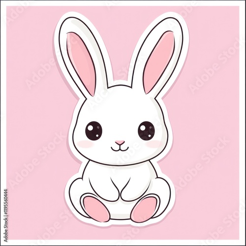 © lestari, Obraz premium Cute white bunny sticker on pink background, springtime design, children's illustration