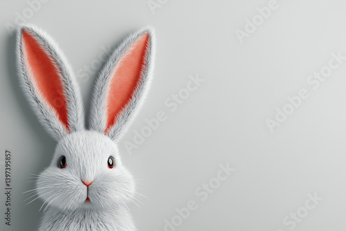 Obraz premium Cute white bunny with red ears looking forward on clean grey background, adorable rabbit character with fluffy fur
